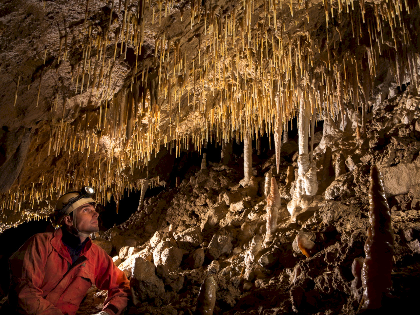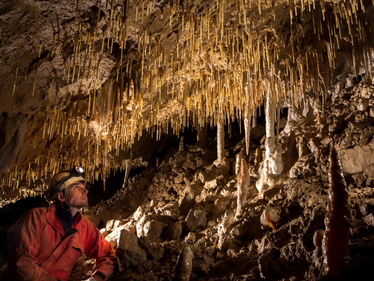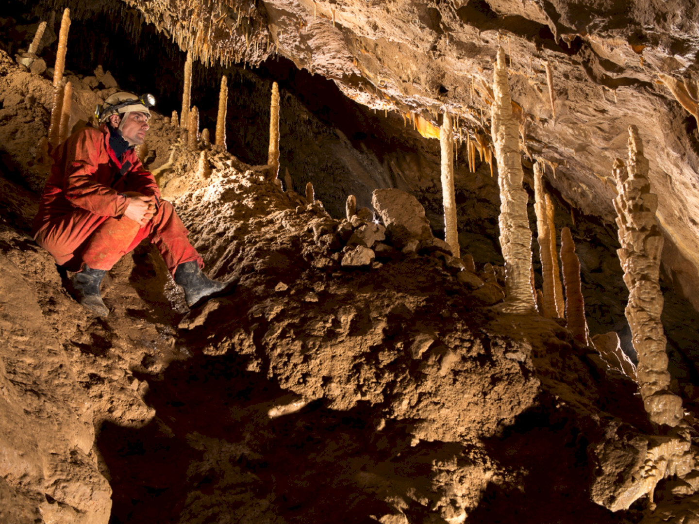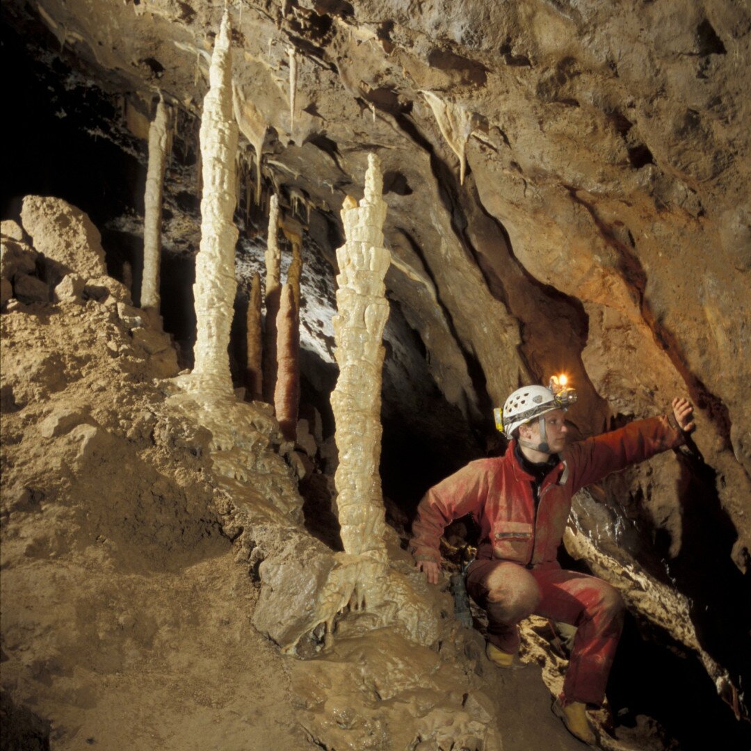In Begleitung von Höhlenführern kann man auf einer Erlebnistour im Overall die geheimnisvolle unterirdische Welt der Tropfsteine kennen lernen.