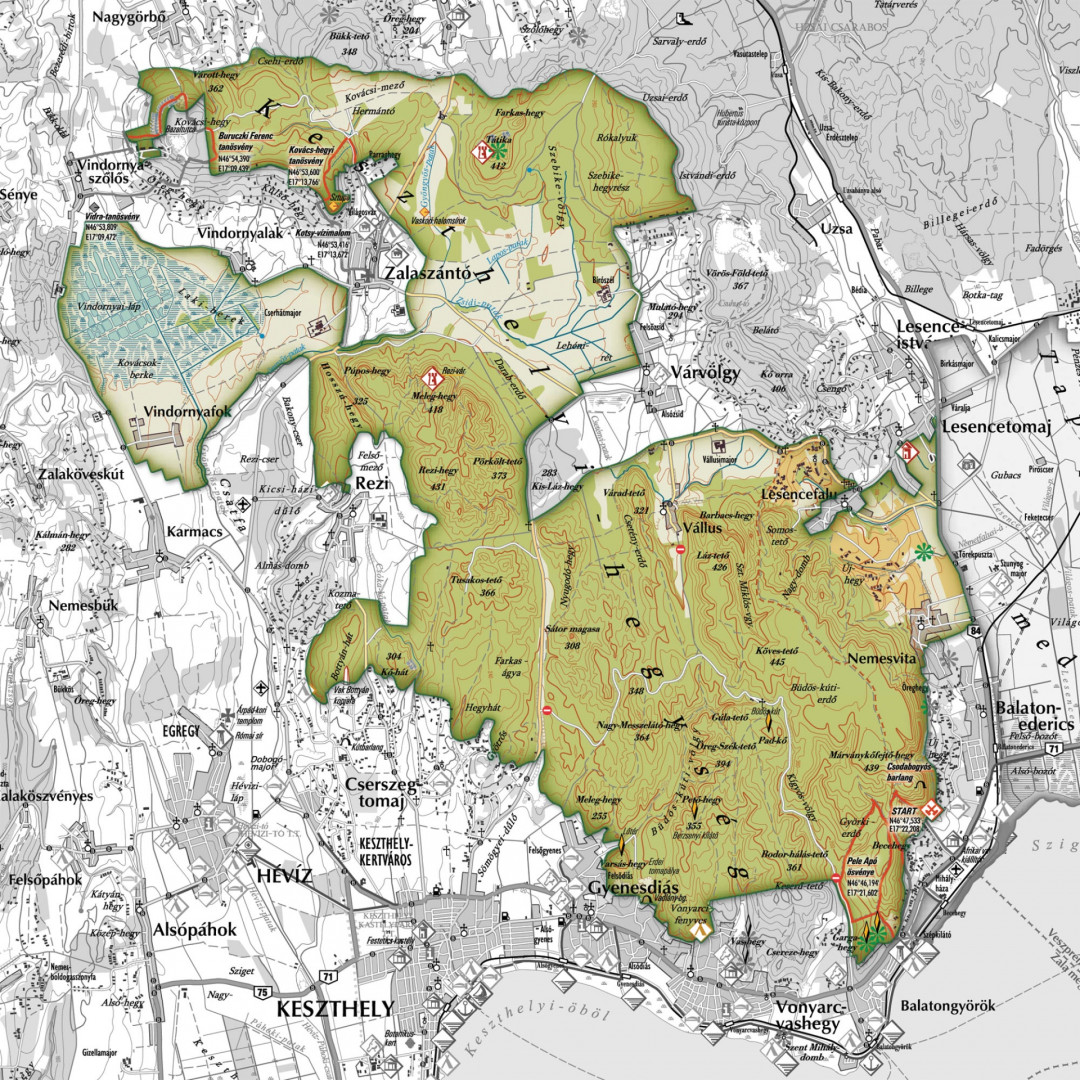 Das Keszthely-Gebirge ist reich an geologischen Schätzen. Jedoch ist der größte Teil des Dolomit- und Basaltblocks mit Wäldern bedeckt, in denen aufgrund der speziellen ökologischen Verhältnisse bestimmte Pflanzen und Tiere beobachtet werden können.