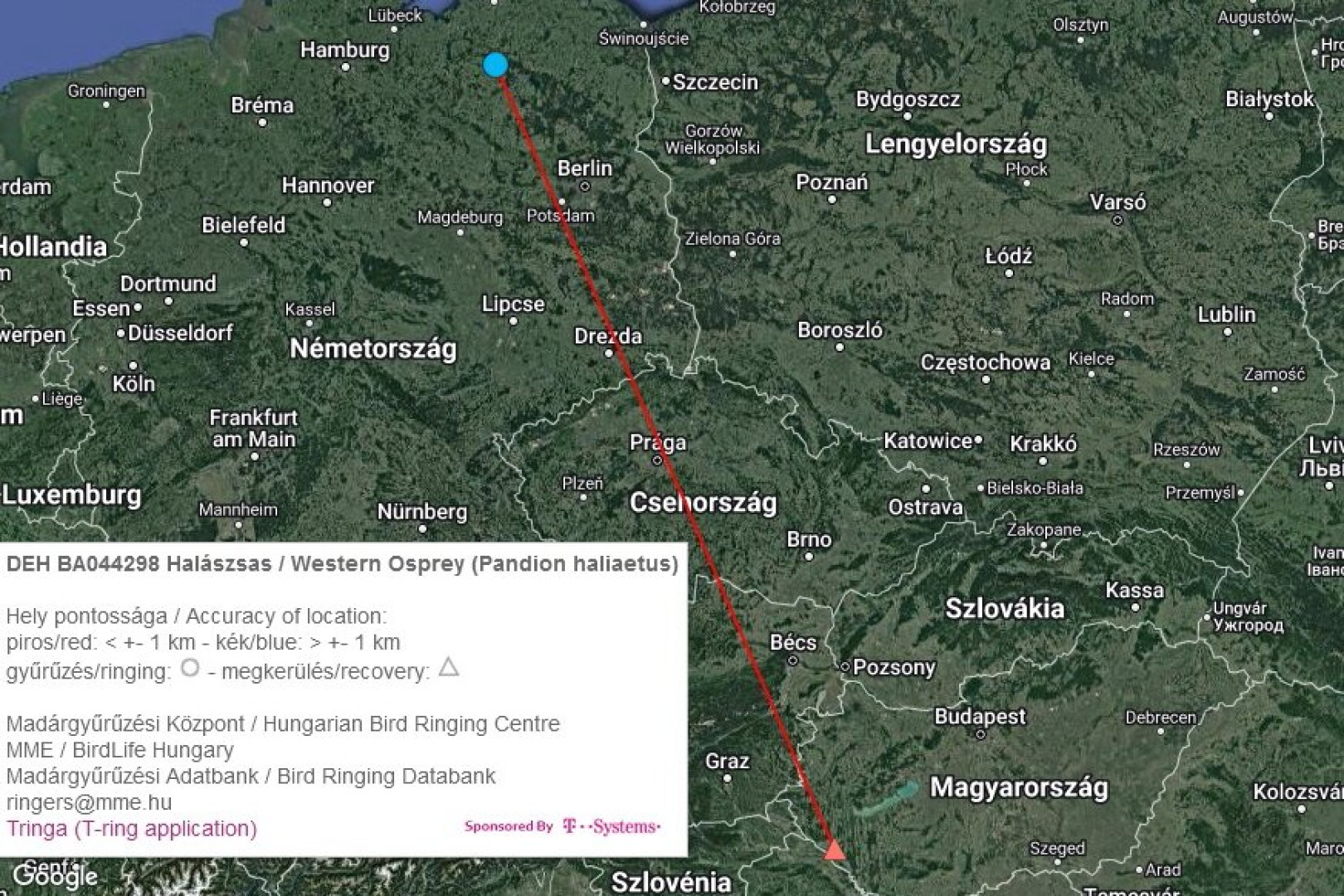 A Magyar Madártani és Természetvédelmi Egyesület Madárgyűrűzési Központjából kaptunk tájékoztatást a megfigyelt madárról. Kiderült, hogy 2023. június 26-án, ÉK-Németországban található Wendisch Waren település melletti 3 fiókás fészekben gyűrűzték az ottani szakemberek. A jeladó szerint Nagykanizsa mellett tartózkodott 2023. november 15 és december 2 között. A gyűrűzése és Nagykanizsára érkezése között majdnem 5 hónap telt el, és légvonalban mérve 869 km a távolságot tett meg.