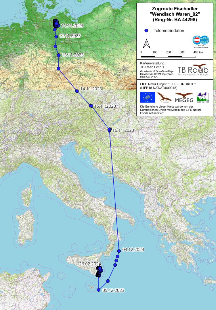 Mivel ifjú sasunknak jeladója is volt, kíváncsiak voltunk, hogy milyen útvonalat járt be, merre időzött. Ezen adatokat most közölte a Hiddensee-i Gyűrűzőközpont egy térkép, és egy rövid e-mail formájában. A levélből kiderül, hogy egy nem mindennapi esetről van szó, mivel a gyűrűzés helyének régiójából, leginkább Spanyolország, Portugália, vagy Nyugat-Afrika területeire vándorolnak a halászsasok, de a szóban forgó egyed Magyarországon át érintette az olasz csizma talpát, majd Szicília keleti partvidékén élvezte a mediterrán telet. Repülési teljesítményét tekintve figyelemre méltó, hogy tőlünk december 2-án indulva három nap alatt lerepült Málta mellé, ami légvonalban 1200 km!