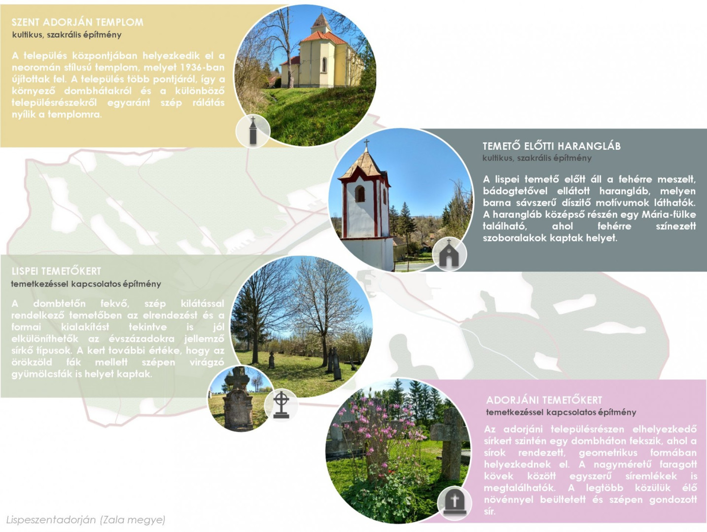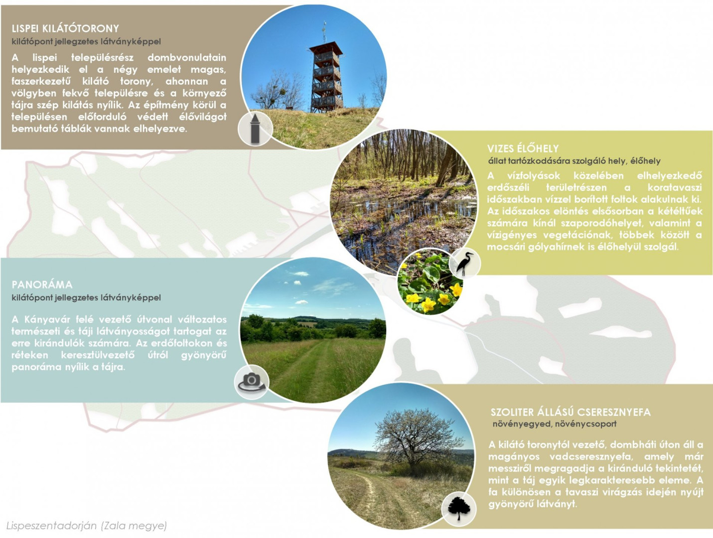 A térképen ábrázolt és fényképekkel is szemléltetett tájérték ismertetőnk következő állomása Lispeszentadorján települése, amely Zala megyében a Mura-Dráva-Duna Bioszféra-rezervátum tervezett bővítési területén található.