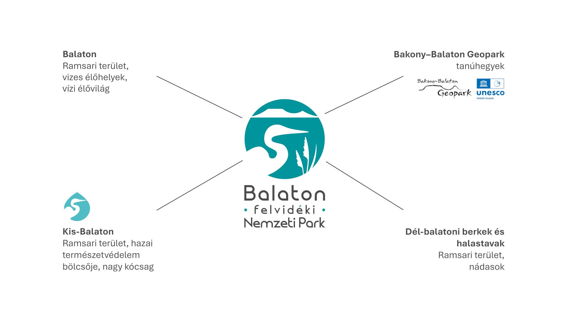 A történelmi mértékű területbővítés kapcsán a Nemzeti Park arculata is megújul. Az új logó a Nemzeti Park négy kiemelt értékét jeleníti meg: a három Ramsari területet (Balaton, Kis-Balaton, Dél-balatoni berkek és halastavak), és a Bakony–Balaton UNESCO Geoparkot, azon belül a Balaton-felvidék jellegzetes tanúhegyeit. A nagy kócsag a hazai természetvédelem bölcsőjét, a Kis-Balatont is szimbolizálja.