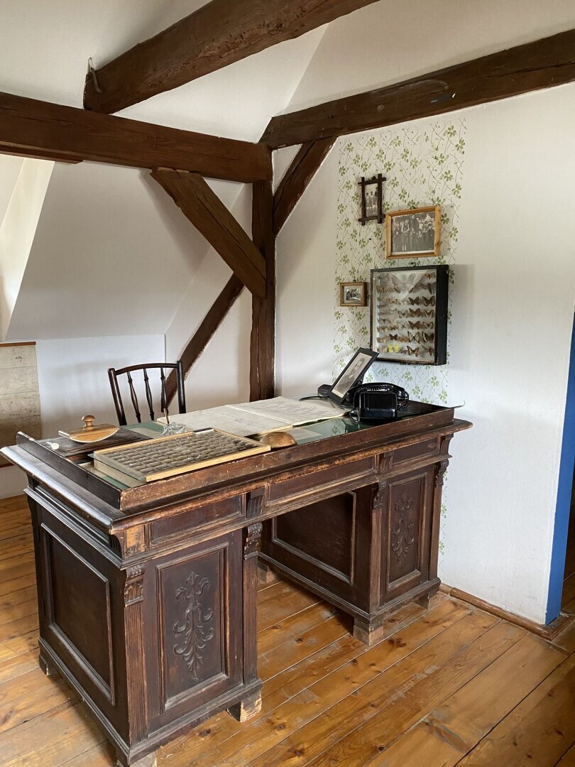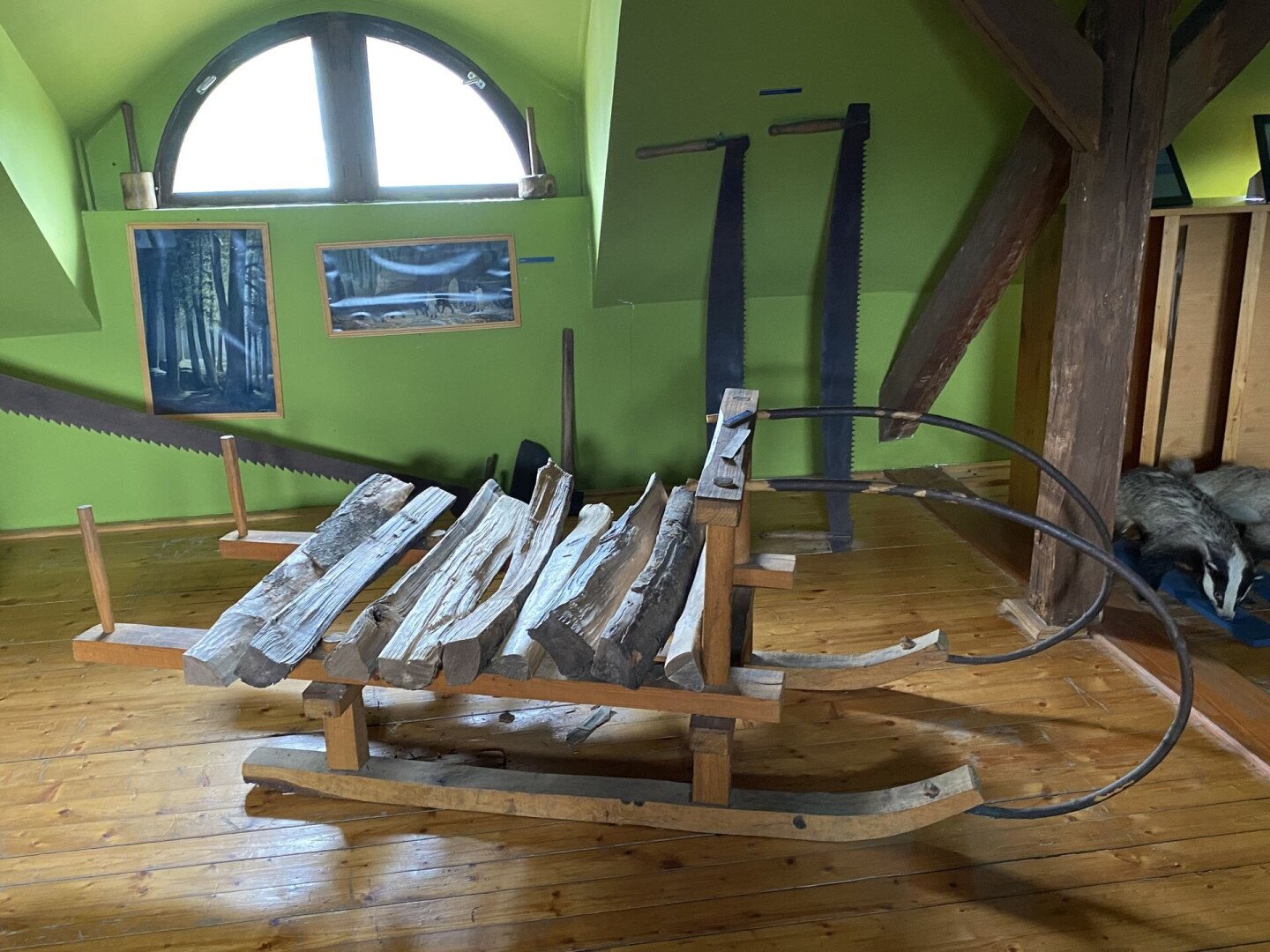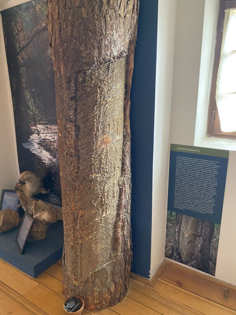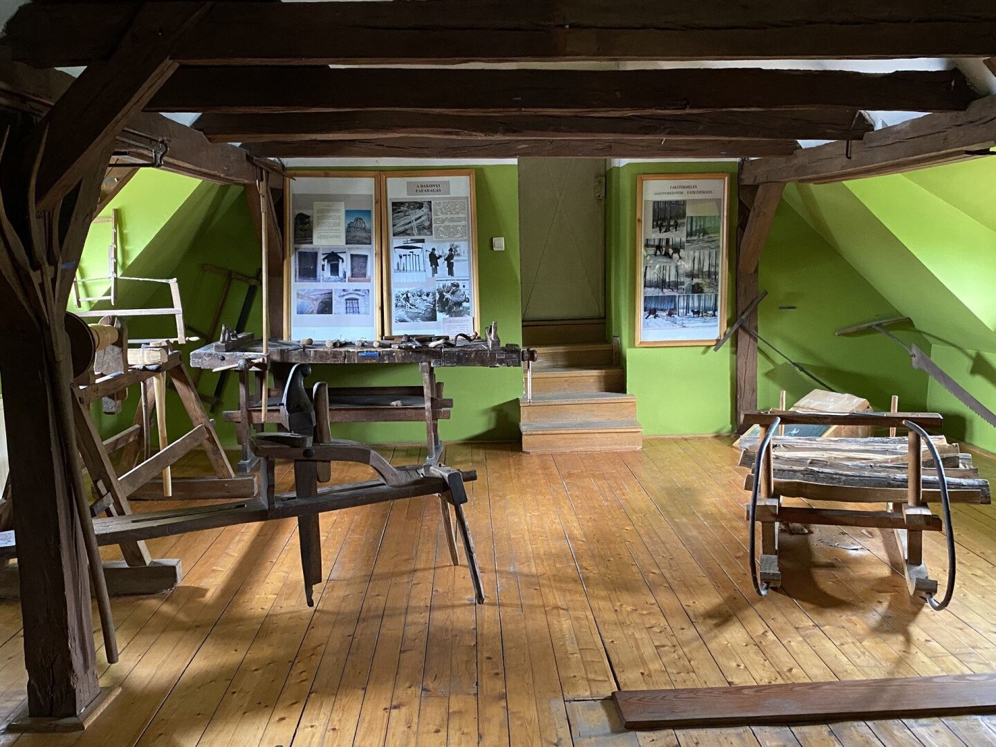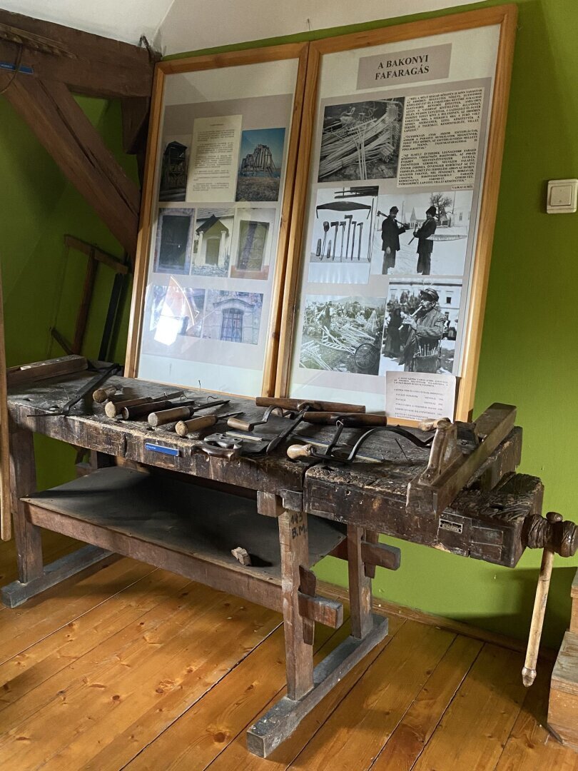 Az emeleti terem a természetben élő, dolgozó, annak javait hasznosító erdész, vadász és a faműves mesterségek tevékenységével ismertet meg. Egy hangulatos diorámában láthatjuk a Bakony vadon élő állatait, s Dani Pál naiv festő képein az egykori Bakonyerdő vadregényes világát. Az erdőgondnoki szobának berendezett kiállító sarok a selmecbányai erdőmérnökképzésnek és Dobó Jenő farkasgyepűi erdőgondnok életművének bemutatásán keresztül az informatika korát megelőző század eleji mérnöki pontosságnak, fegyelmezettségnek, szaktudásnak állít emléket. S ha kipillantunk az ablakon az erdő borította hegyek sorára, megértjük, miért szeretik az itt élők és az erre járók az idők eleje óta e tájat.
