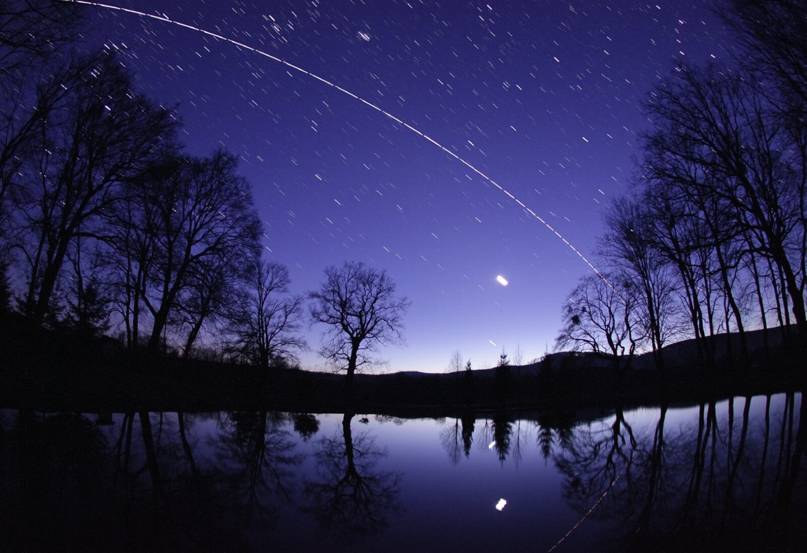 • A Discovery űrsikló és a Nemzetközi Űrállomás íve Bakonybélben a Borostyán-kút tavacskája felett a szürkület színeiben. Alattuk a Hold és a Jupiter fénye tükröződik a víz felszínén.