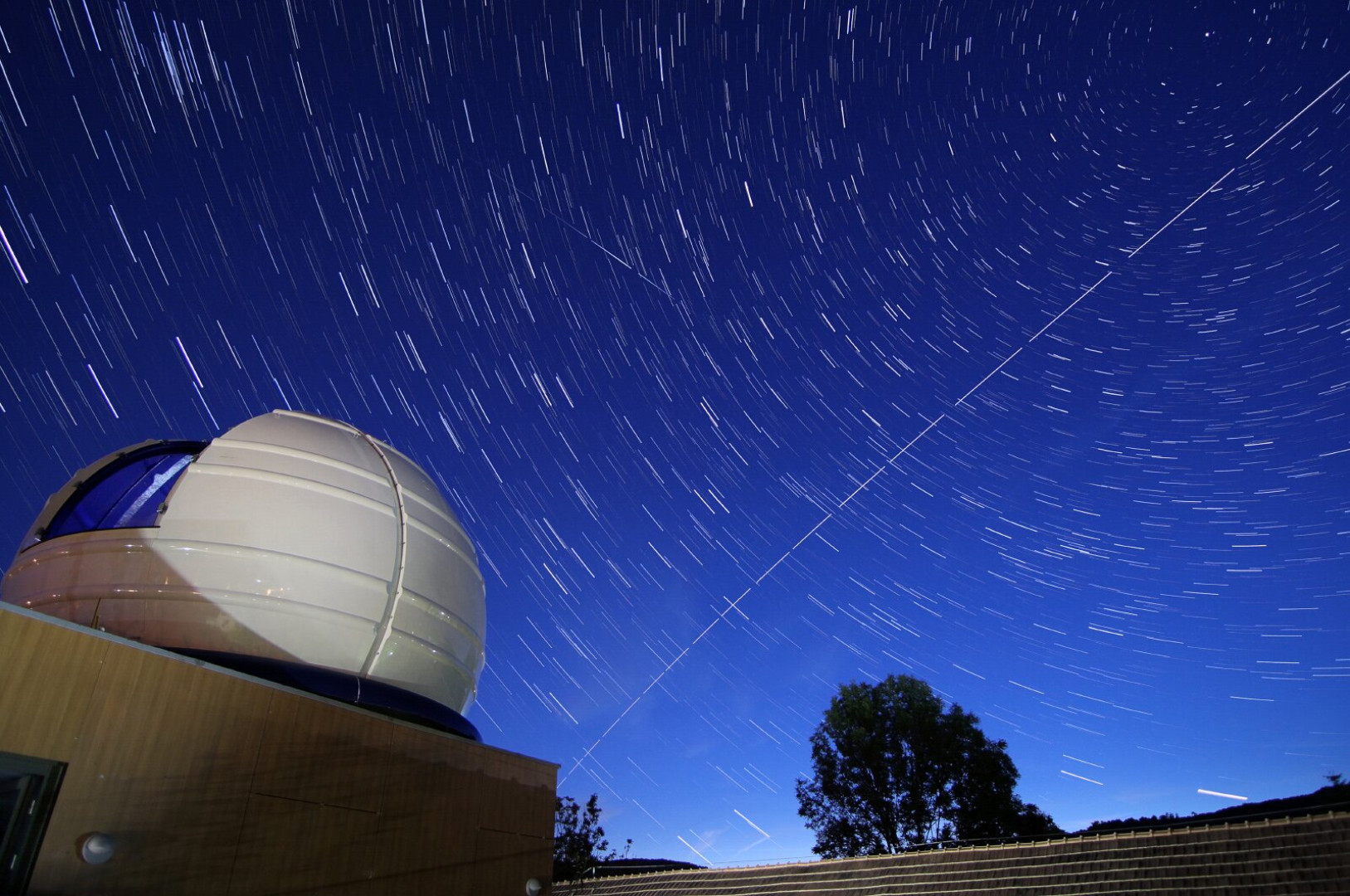 • A Nemzetközi Űrállomás íve és egy műhold felvillanása a Pannon Csillagda kupolája felett.