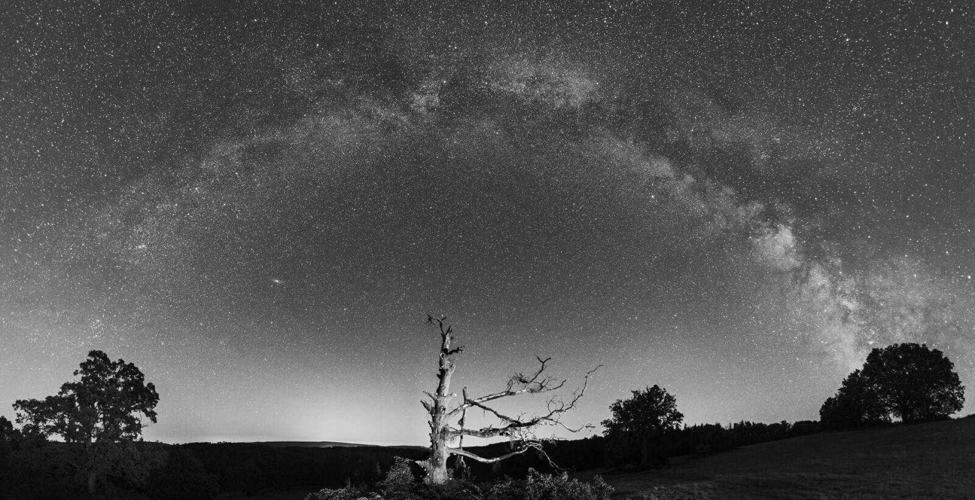 • A panoráma felvételen a Tejút íve horizonttól horizontig látszik, ami egy villám sújtotta fa felett rajzolódik ki a városi fényszennyezéstől távoli környezetben.