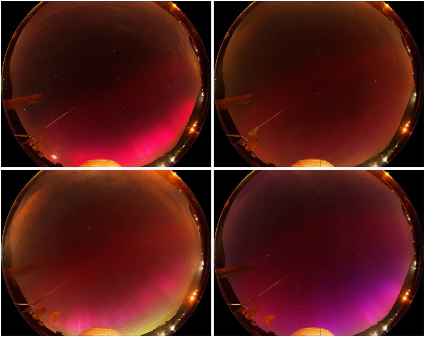 • A sarki fény színeinek változása 2024. május 10-11-e éjszakáján négy különböző időpontban a Pannon Csillagda fényszennyezésmérő kameráján keresztül.