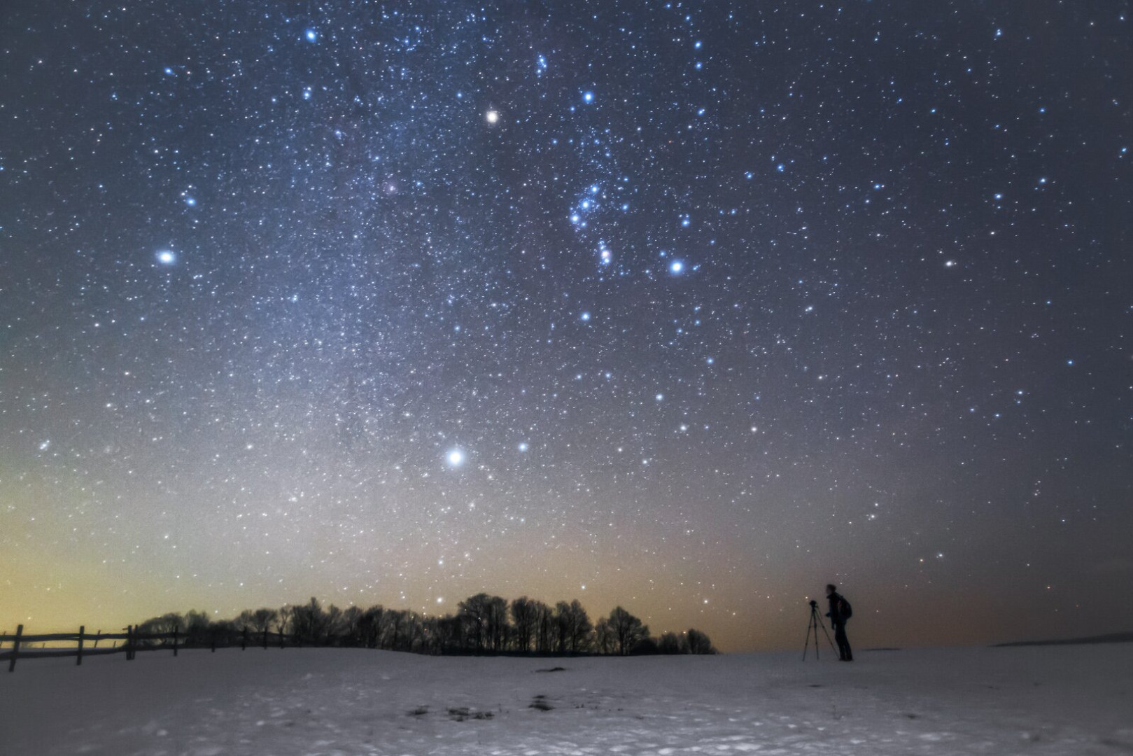 • Szinte kézzel fogható közelségben ragyognak a téli csillagképek a hóval borított bakonyi táj felett.