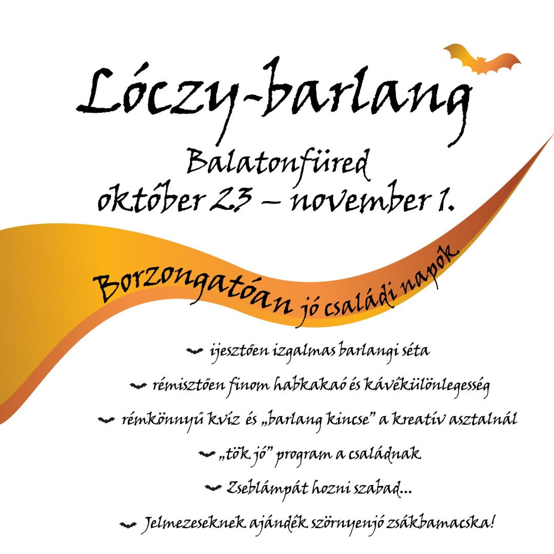 Szeretettel várjuk a balatonfüredi Lóczy-barlang borzongatóan jó családi programjára az őszi szünetben (október 23 - november 1.) kvízzel, kézműves foglalkozással, jelmezben érkezőknek zsákbamacska-ajándékkal.